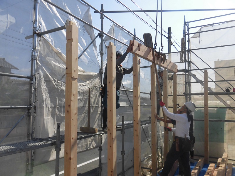 レッカー屋さんと連携を取りながら柱のほぞを梁のほぞ穴にはめ込んでいきます。
