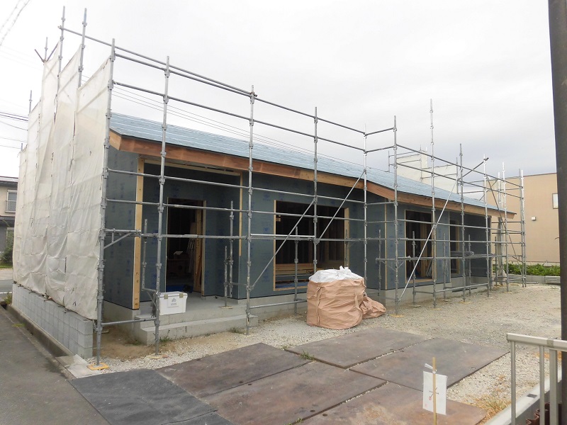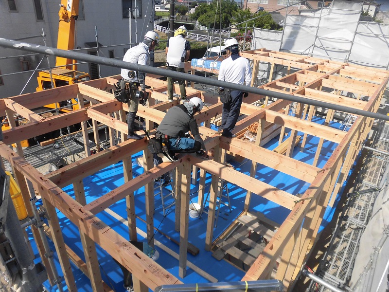 一時的に濡れてしまうのは仕方が無いにしても、雨に濡れてしまう状況を1週間も2週間も放置しておくのはやはり良くないので、2日目は耐力面材となる『EXハイパー』を張る作業を行うようにしています。