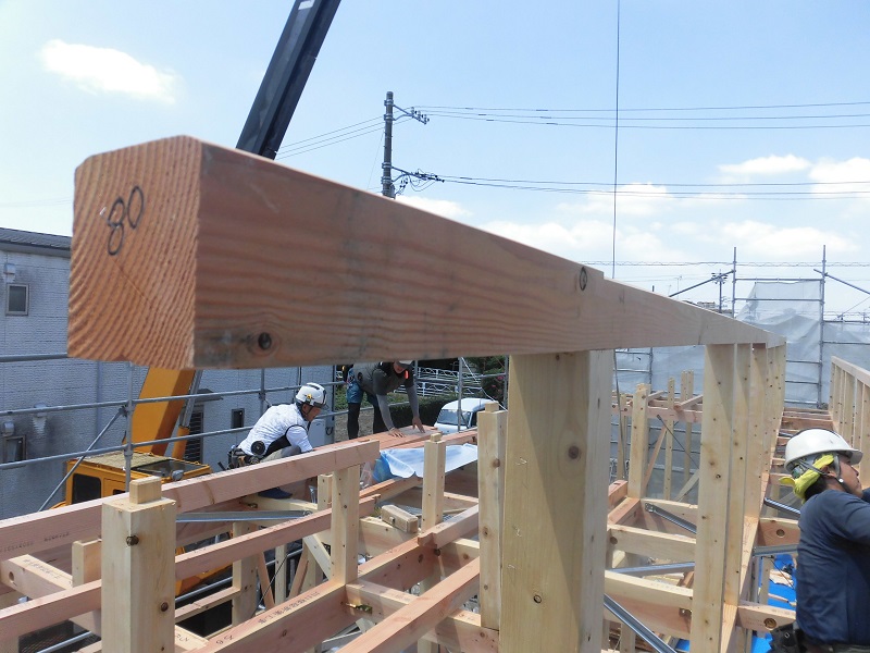 上棟日には柱や梁などの建物の基本構造となる部分の組み立て作業を大工さん数人掛かりで行います。