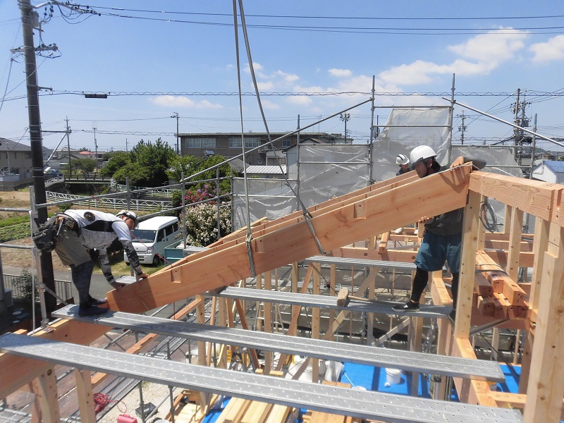 棟木が上がった後は、勾配天井部分の登り梁なんかを納め、更にその登り梁に対して母屋を取付けていきました。