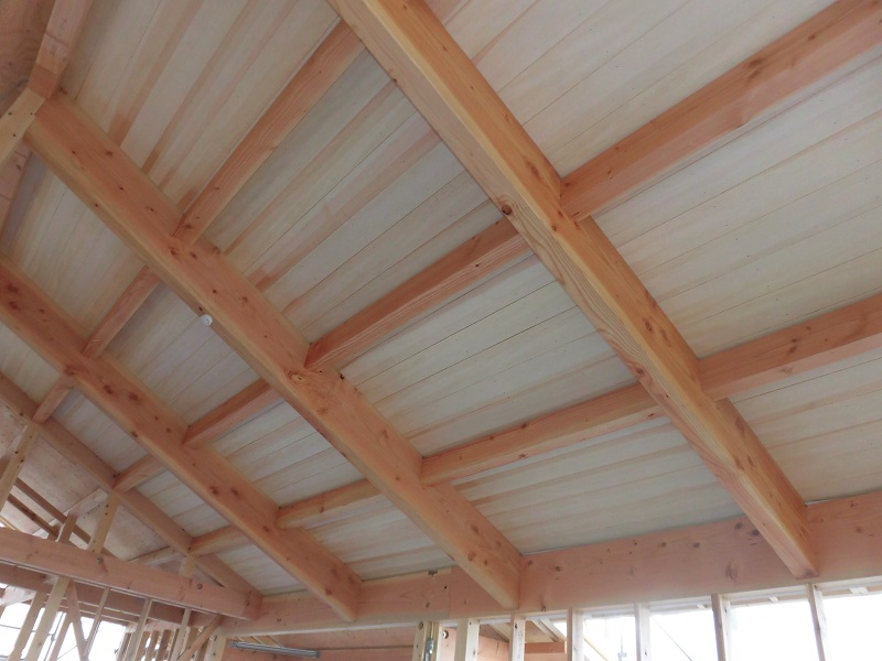 K様邸は平屋のお家で、勾配天井になっている部分なんかもあるので、梁の本数は比較的少なめです。